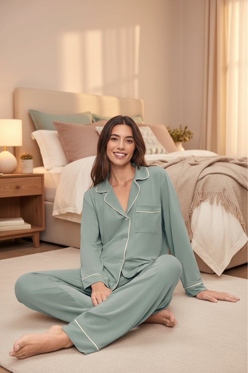 Gisele Long PJ Set in Eucalyptus/Ivory