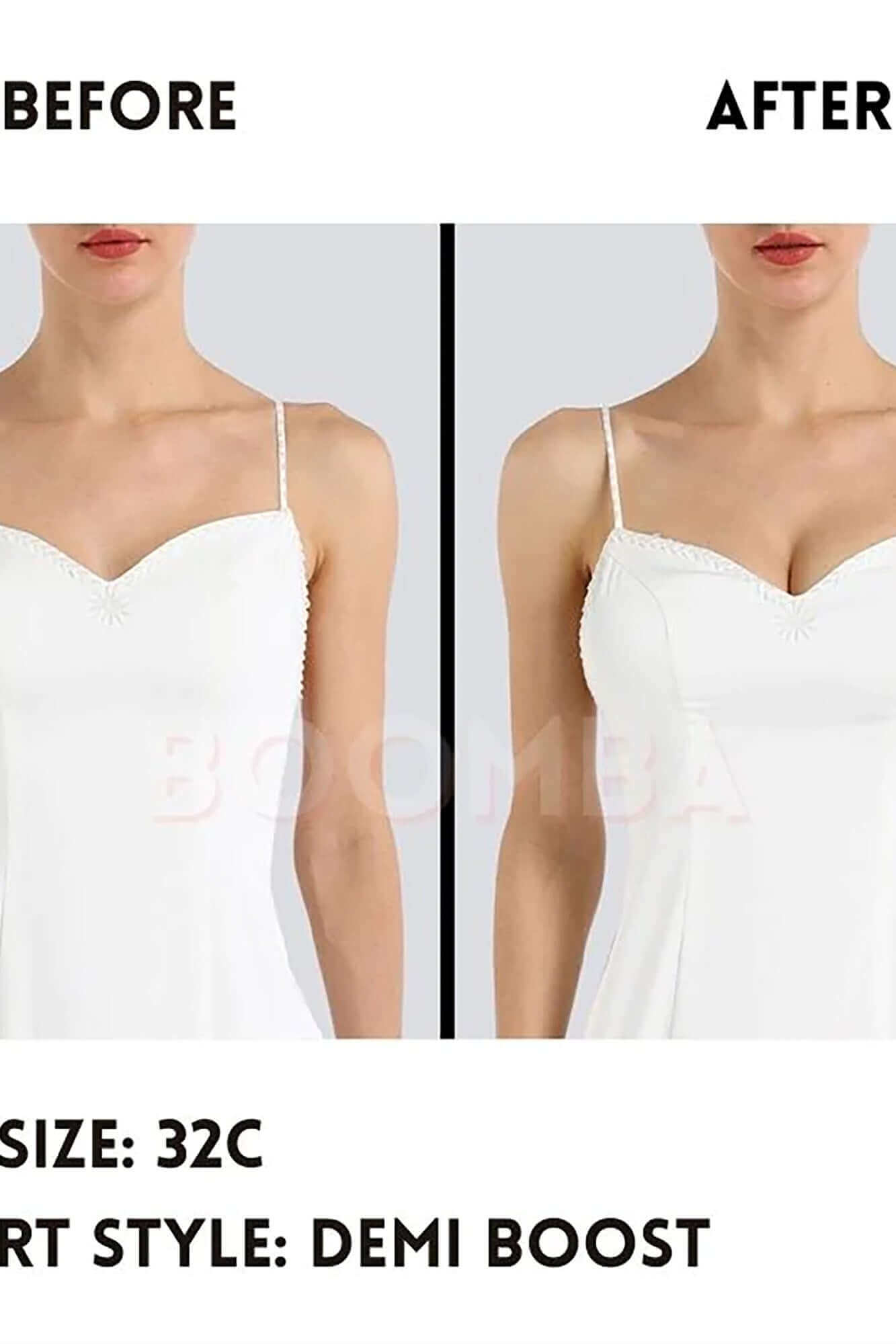 Unlike a sticky bra that is supported by the adhesive, BOOMBA inserts are supported by the clothing, they cannot stay up by themselves. It is crucial to wear them in tight, structured, and fitted tops. This padded insert is specially designed for demi cup styles. Stick it inside wedding dresses, bras, bandeau bikinis, etc. for a natural-looking boost.