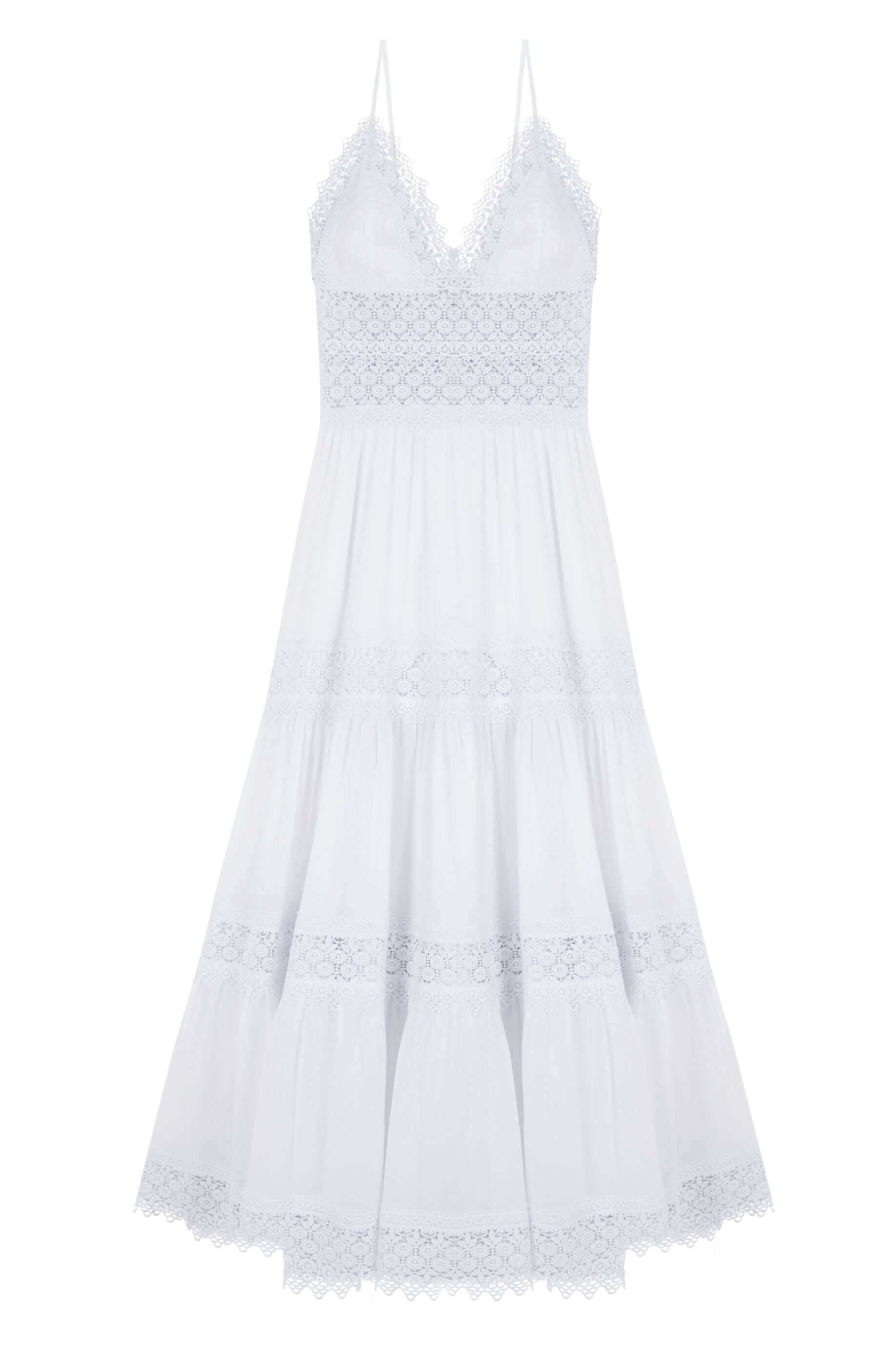Indulge in summer allure with the Charo Ruiz Long Cindy Dress in White, a must-have for your wardrobe. Crafted from soft cotton, this dress combines peek-a-boo transparencies with sensual elegance, creating a captivating contrast. Featuring a "V" shaped neckline and contoured coverage with thin straps, it offers a flattering silhouette. The openwork guipure waistline adds a touch of sophistication, making it perfect for special occasions or casual outings with effortless style.