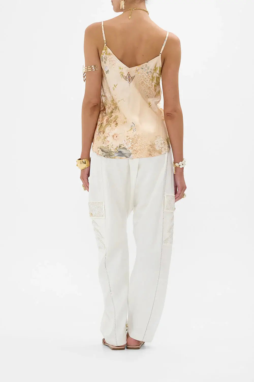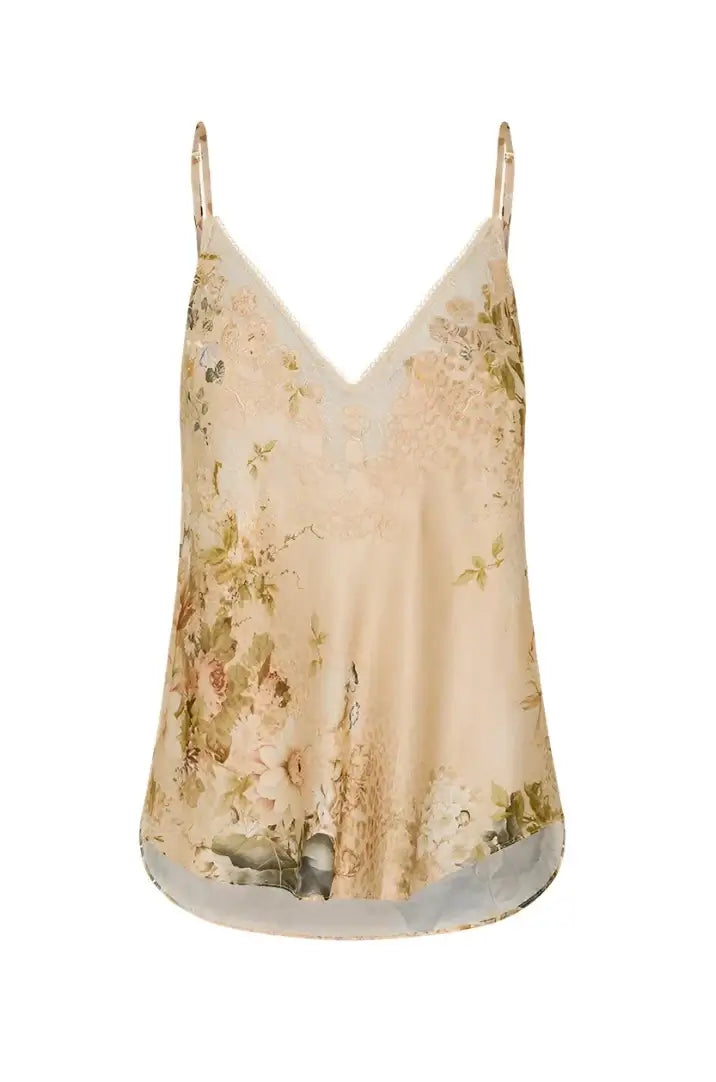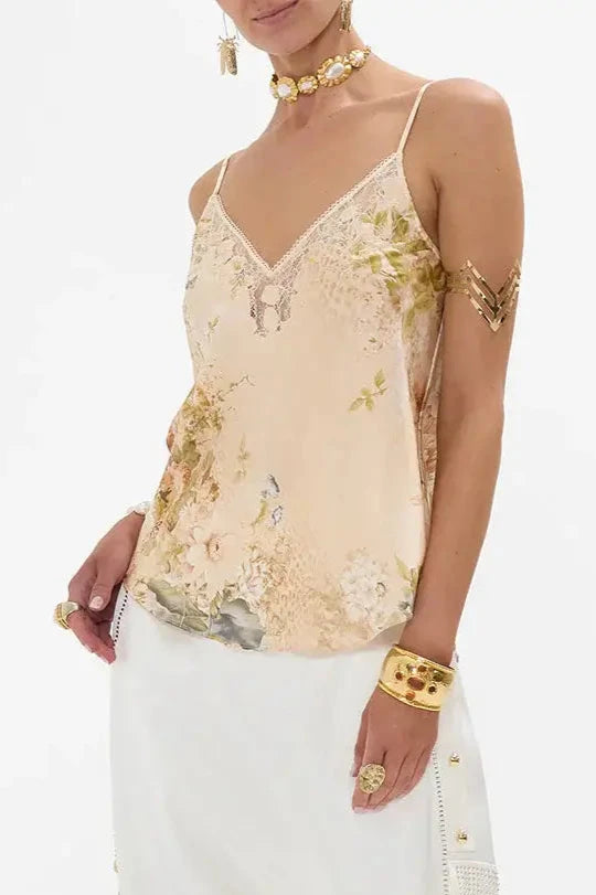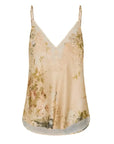 Camilla's V-Neck Bias Cami features delicate florals and golden fronds amidst leopard print highlights. Crafted from luxurious silk, the cami boasts a bias cut that contours the body and cascades into supple, curved hemlines. A chic v-neckline in the front and back, along with adjustable straps, exudes an aura of refined sophistication.
