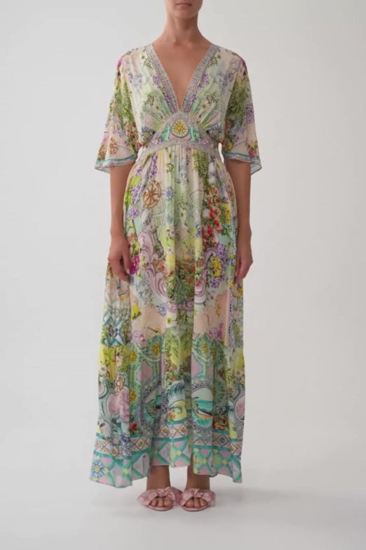 Camilla Waisted Dress with Hem Ruffle in Just Coasting radiates breezy sophistication, capturing a kaleidoscope of pastel dreams, sunlit charm, and coastal treasures inspired by boundless seaside reveries. Meticulously handcrafted, this luxurious CAMILLA silk maxi dress showcases a softly bloused bodice that gracefully gathers into an adjustable waistband. The gently gathered skirt cascades from the waist, flowing elegantly and ending in a lush, deep ruffle hemline. Crafted from subtly textured silk crepe, this exquisite fabric drapes beautifully, ensuring versatility in styling and exceptional comfort with its breathable, cooling touch.